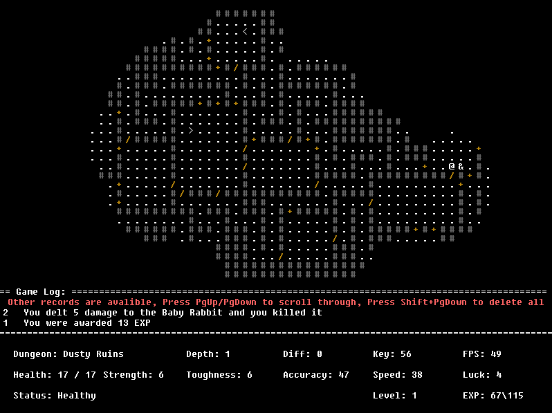 Adding the stats, XP and leveling to the game was fun as I had never directly worked on a combat system before. While I am sure what I ended on was not balanced in the slightest, it had a difficulty curve and numerous monsters that would show up as you progressed further into the dungeon.